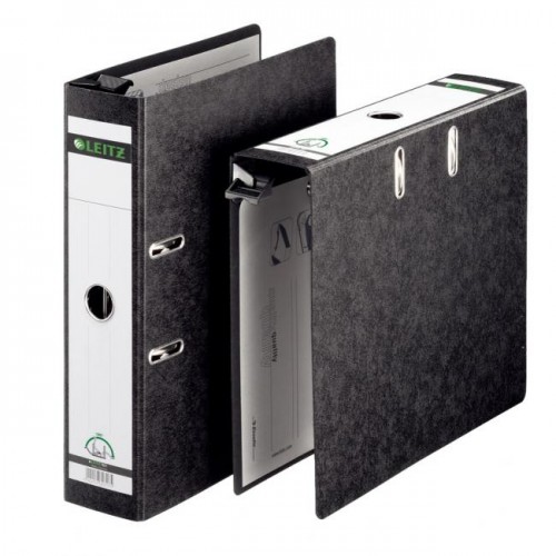 Pákový zakladač formátu A4 vyrobený z tvrdého odolného kartonu s dizajnom kože, zaisťujúcim dlhú životnosť zakladača a plastovým vysúvacím závesným mechanizmom. Rovnaké rozpätie závesného mechanizmu zakladača s lištami závesných obalov umožňuje ich spoločné zavesenie. Vybavený vysokokvalitnou mechanikou Leitz, chrbtovým krúžkom a štítkom na pipis. šírka chrbta 5 cm, farba čierna.