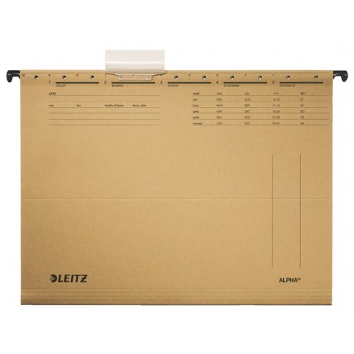 Prírodné závesné zakladacie dosky Leitz Alpha Standard s rozmermi 348 x 260 mm sú vhodné na ukladanie dokumentov formátu A4. Majú popisovateľný linajkový povrch, kovové ušká a 6 cm držiak na štítok, ktorého miesto sa dá meniť. Sú vyrobené z vynikajúceho kartónového materiálu s certifikátom FSC. Balenie obsahuje 25 ks.