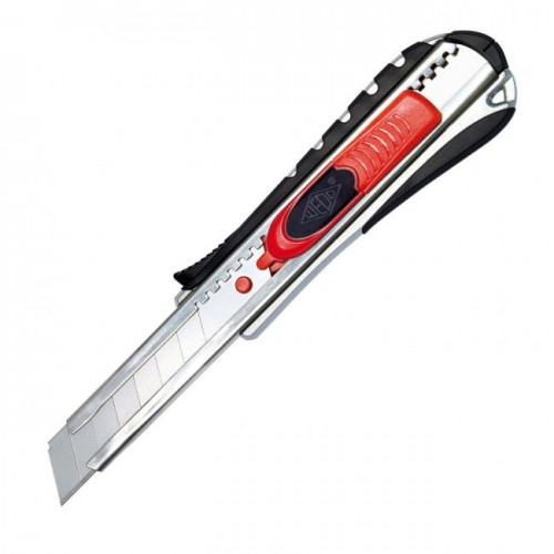 Kovové rezače s gumenou zónou, integrovaným odlamovačom čepele s funkciami štandardného a bezpečnostného rezača. Po ukončení rezu alebo v prípade, keď sa ostrie kĺže po rezanom materiáli, sa čepeľ automaticky zasunie. Čepeľ možno vysúvať aj pomocou integrovaného bežca. Šírka čepele 18 mm. Schválené inštitútom TÜV. Farba červená/ čierna.
