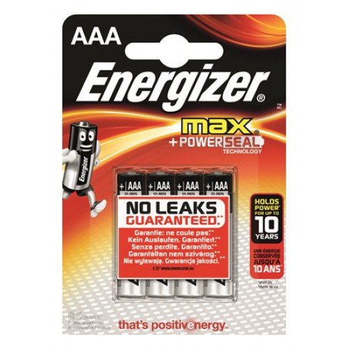 Batérie AAA mikro 4 ks Energizer Max. Batérie s energiou až na 10 rokov. Sú alkalické. Elektrochemický systém Zinc-Manganese Dioxide, Zn/MnO2. Neobsahuje kadmium ani ortuť. IEC referencia IEC-LR6. Menovitý výkon 1.5 voltov. Hmotnosť 23 g. Balenie obsahuje 4 kusy.