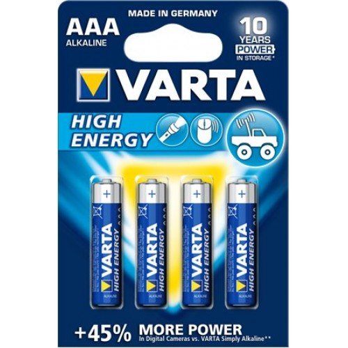 Alkalické mikro batérie Varta High Energy AAA s napätím 1,5 V sú vhodné k prenosným zariadeniam, ktoré potrebujú veľa energie, napr. bezdrôtové myši, klávesnice. Balenie obsahuje 4 ks.