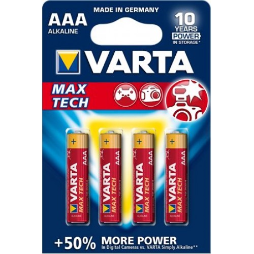 Alkalické mikro batérie Varta Max Tech AAA s napätím 1,5 V s precíznou Varta kvalitou do high-tech zariadení, napr. MP3 prehrávače, fotoaparáty. Balenie obsahuje 4 ks.