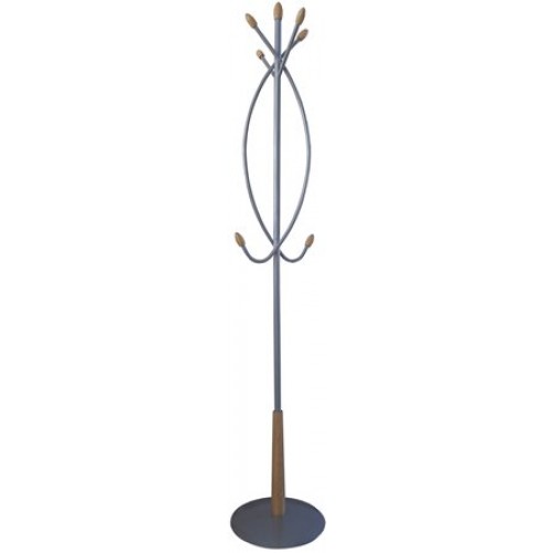 Stojanový vešiak Paso strieborný. Kovový stojanový vešiak. Je strieborno-sivej farby. Má drevené doplnky v prírodnej farbe. Má držiakom na dáždniky. Výška 181 cm, šírka 34,5 cm, priemer podstavca 34 cm.