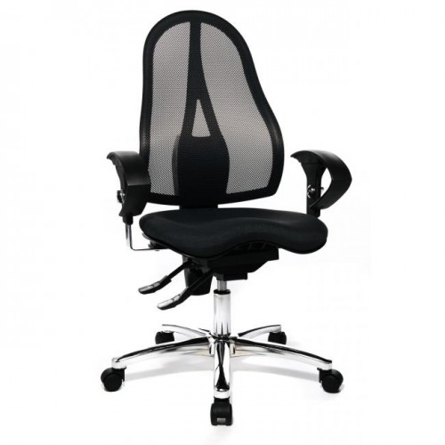 Stolička s pohyblivým orto-sedákom vybavená kĺbom body-balance-tec. Vysoké operadlo čalúnené samonosnou sieťovinou, plynule výškovo nastaviteľné. Pevný a komfortný permanentne kontaktný mechanizmus, stabilný kovový chrómovaný kríž so samobrzdiacimi bezpečnostnými kolieskami. Dodávaná s výškovo nastaviteľnými podrúčkami. Poťahová látka na sedáku 100% polypropylén, nosnosť 110 kg. Farba čierna.