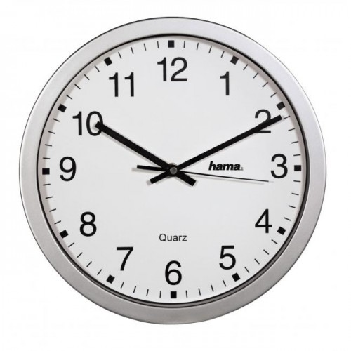 Quartz hodiny s analógovým zobrazením času. Veľký biely ciferník s arabskými číslicami a sekundovou ručičkou, hmotnosť 520 g, priemer 30 cm, hrúbka 4,5 cm, materiál plast, farba rámu strieborná. Batéria AA je súčasťou balenia. Farba strieborná.