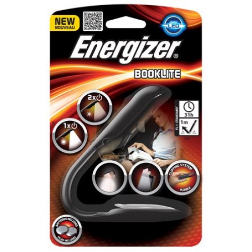 Lampa na čítanie Energizer Booklite 2 x CR2023. Lampa vhodná pre knihy, prenosné počítače a elektronické knihy. Má flexibilný gumový krčok pre upravenie svetla podľa potreby, nárazuvzdorná, prevádzková doba 31 hod.