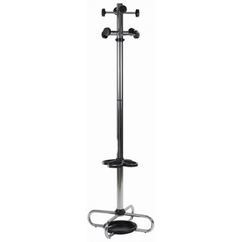 Stojanový vešiak kovový pochrómovaný. Kovový vešiak s držiakom na dáždniky. Výška 174 cm, priemer podstavca 56 cm.