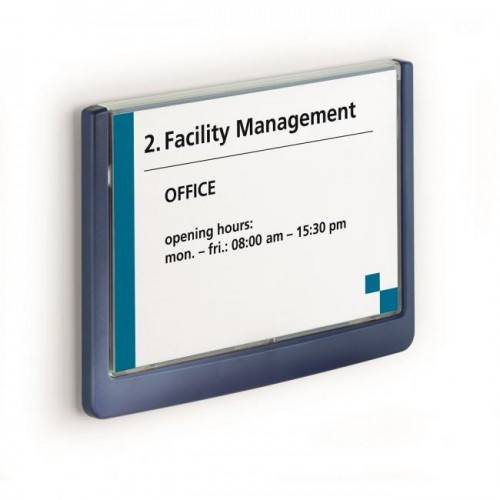 Moderná informačná tabuľka na dvere s lemom v atraktívnej modrej farbe. Predný panel sa otvára na jedno zatlačenie, a tým sa jednoducho sprístupnia vložené popisné papiere, ktoré sa môžu vymieňať podľa potrieb. Tabuľka je ideálna do kancelárií, úradov, škôl, univerzít a hotelov. Súčasťou balenia je montážna sada s názorným návodom. Namiesto pevného montovania môže byť tabuľka k povrchu aj prilepená.
