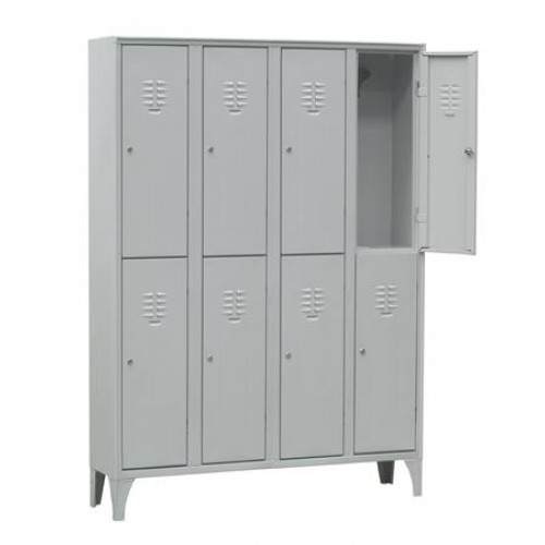 Šatňová skriňa 8 políc. Oceľová skrinka sivej farby. Má bezpečnostný zámok s 2 kľúčmi, tyč na vešiaky a 3 vešiaky, UMR4, UMR6, vešiak UMR8. Vetranie je zabezpečené vetrákmi. Má miesto na štítok, 15 cm nohy alebo plný podstavec. Šírka priečinkov je 30 cm.