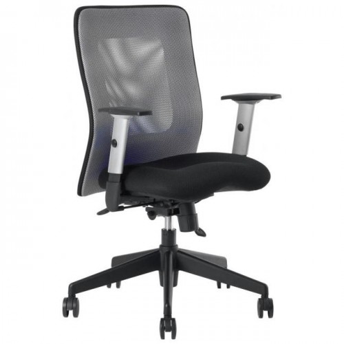 Kancelárska otočná stolička s podrúčkami. Synchrónny mechanizmus s aretáciou v 4 polohách, výškovo nastaviteľné podrúčky, výškové nastavenie sedáka, nastavenie sily protiváhy podľa telesnej hmotnosti, univerzálne kolieska na tvrdú aj mäkkú podlahu. Anatomicky tvarovaný sedák, operadlo obojstranne čalúnené samonosnou sieťovinou. Výška chrbtovej opierky 53 cm. Poťah stoličky látka. Nosnosť 120 kg. V rovnakom dizajne rokovacia stolička CALYPSO MEETING.