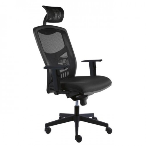 Moderná kancelárska stolička s vysokým fixným sieťovaným operadlom s výškovo nastaviteľnou bedrovou opierkou a s bohatým čalúnením sedadla.
