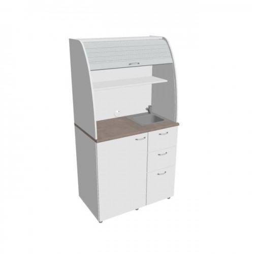 • Dve police vo vrchnej časti kuchynky poskytujú dostatočnú kapacitu na poháre, šálky a taniere. Na pracovnú dosku môžete umiestniť napr. kávovar a káblovou priechodkou v zadnej časti vyvediete kábel z priestoru kuchynky.