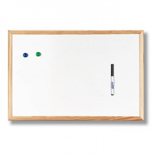 Biela magnetická popisovateľná tabuľa so svetlým dreveným rámom.