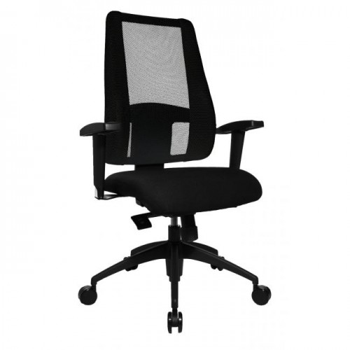 Veľmi pohodlná kancelárska stolička pre zdravé sedenie so vzdušným operadlom, vhodná predovšetkým pre ženy. Ergonomicky tvarované operadlo potiahnuté vzdušnou sieťovinou a špeciálnym čalúnením v bedernej oblasti chrbtice, výškovo nastaviteľným systémom „up-and-down“. Špeciálny sedák so 7 rôznymi zónami a odlišnými stupňami tvrdosti, vrátane pružinovej kostry, s patentovaným body-balance-tec - kĺbom pre dynamické sedenie. Robustný synchrónny mechanizmus, nastaviteľný podľa hmotnosti sediaceho, vrátane výškovo nastaviteľných podrúčok s mäkčeným povrchom. Kvalitný a stabilný kríž z čierneho polyamidu. Nosnosť 110 kg. Farba čierna.
