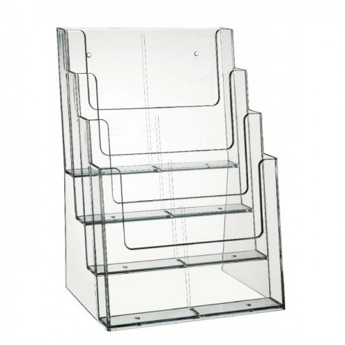 Stojan na prospekty formátu A4 so štyrmi oddielmi. Materiál priehľadný číry plast. Rozmery (š x v x h) 230 x 345 x 170 mm.