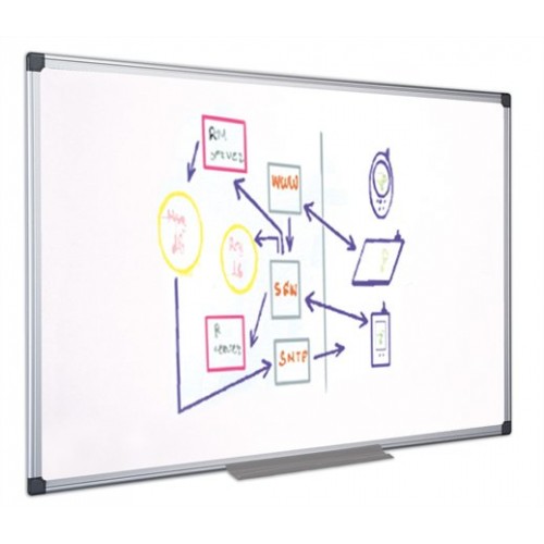 Biela smaltovaná magnetická tabuľa Victoria s rozmermi 60 x 90 cm má popisovačom popisovateľný a za sucha utierateľný oceľový povrch, ktorý je výnimočne hladký a odolný voči poškriabaniu. So širokým sivým držiakom na písacie potreby, miernym odzrkadľovaním s trvácnym hliníkovým rámom, ktorý má sivé zaoblené rohové elementy. Balenie obsahuje súčiastky na upevnenie a držiak na písacie potreby. 25 ročná záruka na povrch.