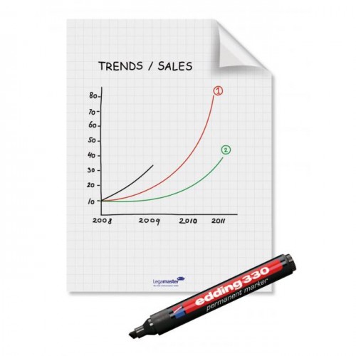 Rolka fólie s 25 štvorčekovanými listami (rozmer štvorčeka 2,5 × 2,5 cm) z bieleho polypropylénu v šírke 60 cm. Perforácia po 80 cm. Popisovanie permanentnými popisovačmi (edding). Elektrostatický náboj umožní priľnutie filmu na rôzne povrchy - sklo, stenu, drevo a tapetu bez použitia lepidla. Fóliu jednoducho odmotáte, v perforovanom mieste odtrhnete a zľahka pritlačíte na daný povrch. Na obale hárku je perforácia na uchytenie balenia na flipchartovú tabuľu. Povrch fólie umožní tiež udržanie papierových poznámok bez ich nalepenia. Väčšie balenie 4 blokov.