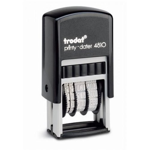 Dátumová pečiatka Trodat Printy Dater 4810 s náhradnou poduškou 6/4910 a s výškou číslic 3,8 mm má plastové telo, čiernu podušku a samofarbiaci systém. Páska sa dá používať 12 rokov.