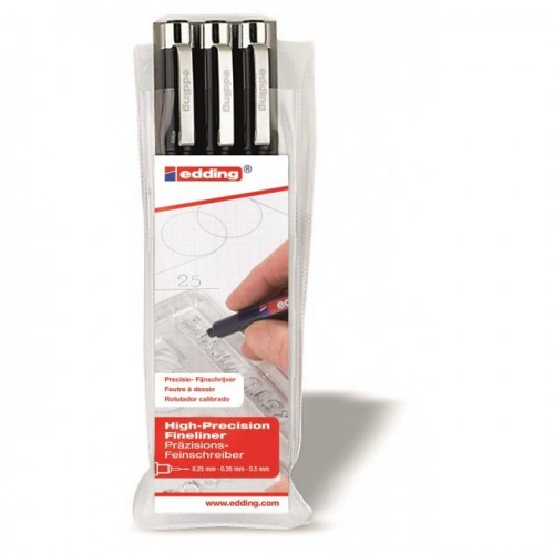Špeciálny jednorazový popisovač s vláknitým hrotom, kovovým klipom a uzáverom je určený na kreslenie, náčrty, technické kreslenie a pod. Plnený vo vode rozpustným atramentom, ktorý na svetle nebledne. Farba čierna. Balenie sada 3 ks po jednom v hrúbkach 0,1 / 0,3 / 0,5 mm.