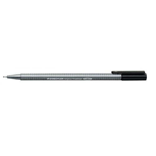 Liner Staedtler Triplus 0,3 mm čierny. Liner má kovový hrot, plastové telo trojuholníkového tvaru. Nevyschne ani bez uzáveru, atrament je na vodnej báze. Z textilu sa dá vyprať. Hrúbka písma 0, 3 mm.