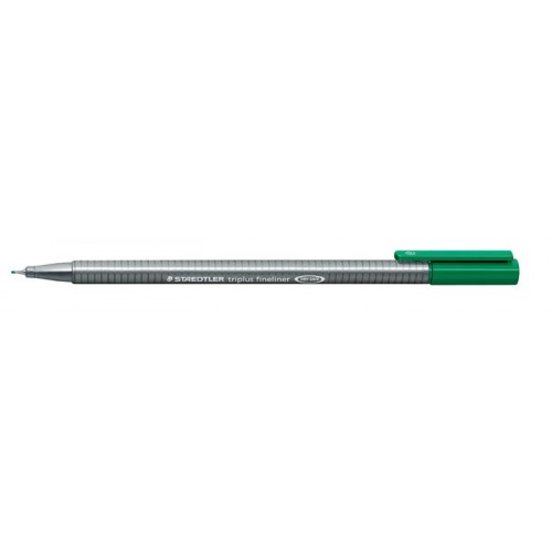 Liner Staedtler Triplus 0,3 mm zelená. Liner má kovový hrot, plastové telo trojuholníkového tvaru. Nevyschne ani bez uzáveru, atrament je na vodnej báze. Z textilu sa dá vyprať. Hrúbka písma 0, 3 mm.