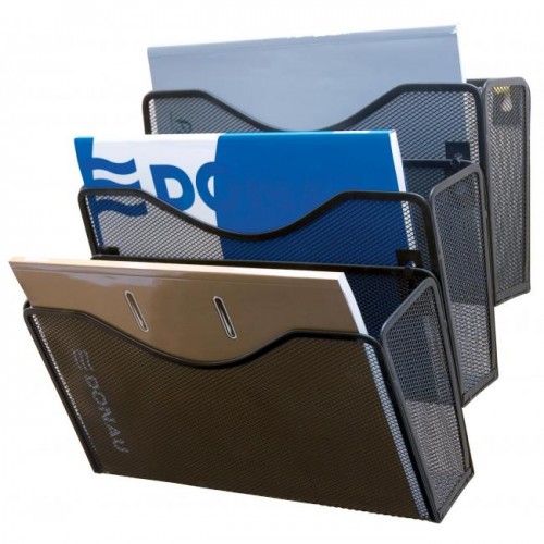 Stojan na stenu s 3 odkladačmi na časopisy a dokumenty do formátu A4+ v drôtenej úprave. Rozmery (š×v×h) 325×330×230 mm.