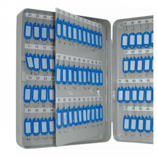 Uzamykateľná skrinka z pevnej ocele na bezpečné uloženie kľúčov. Cylindrický zámok dodávaný s 2 kľúčmi. Zahŕňa rôzne sady vešiakov na kľúče, štítkov a indexového listu. Obsahuje tiež súpravu na upevnenie na stenu. Farba sivá.