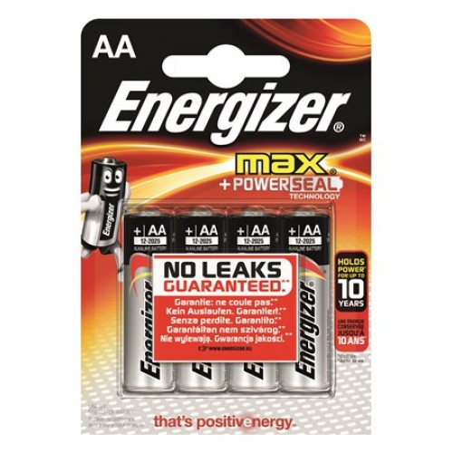 Batérie AA tužkové 4 ks Energizer Max. Batérie s energiou až na 10 rokov. Sú alkalické. Elektrochemický systém Zinc-Manganese Dioxide, Zn/MnO2. Neobsahuje kadmium ani ortuť. EC referencia IEC-LR3. Menovitý výkon 1.5 volt. Hmotnosť 11,5 g. Balenie obsahuje 4 kusy.