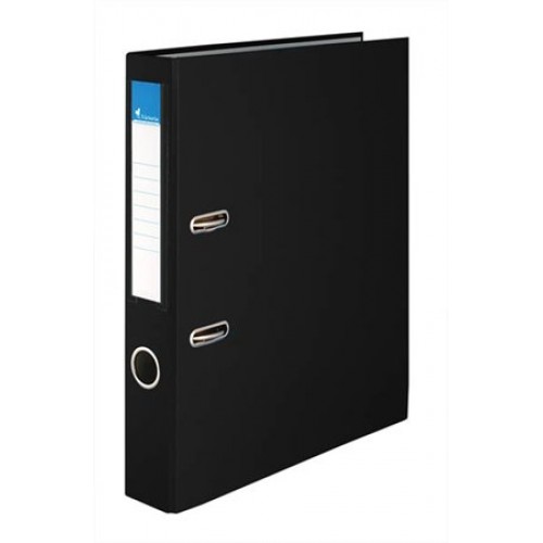 Čierny pákový zakladač Victoria 50 mm bez spodného kovania chráni nábytok a je vhodný na uchovávanie dokumentov formátu A4 a na každodenné použitie. Má chrbtový otvor a vymeniteľný chrbtový štítok. Zvonka PVC povrch, zvnútra kartón.