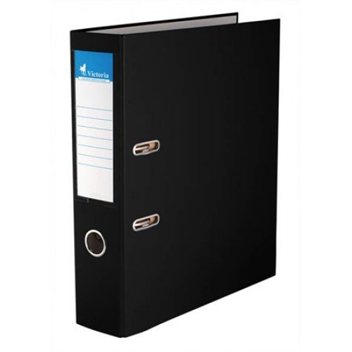 Čierny pákový zakladač Victoria 75 mm bez spodného kovania chráni nábytok a je vhodný na uchovávanie dokumentov formátu A4 a na každodenné použitie. Má chrbtový otvor a vymeniteľný chrbtový štítok. Zvonka PVC povrch, zvnútra kartón.