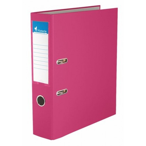 Ružový pákový zakladač Victoria 75 mm bez spodného kovania chráni nábytok a je vhodný na uchovávanie dokumentov formátu A4 a na každodenné použitie. Má chrbtový otvor a vymeniteľný chrbtový štítok. Zvonka PVC povrch, zvnútra kartón.