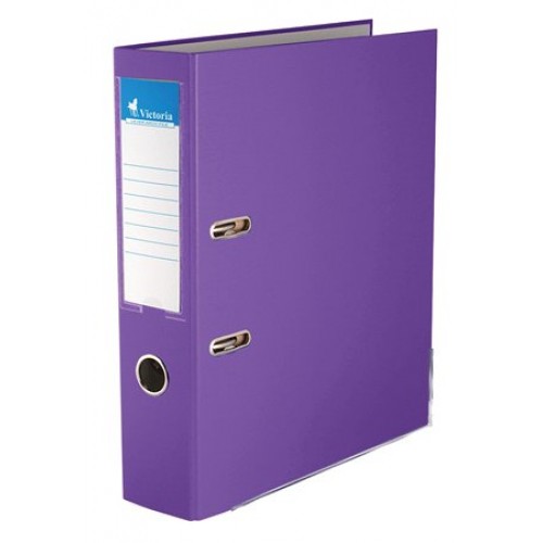 Fialový pákový zakladač Victoria 75 mm s ochranným spodným kovaním je vhodný na uchovávanie dokumentov formátu A4 a na každodenné použitie. Má chrbtový otvor a vymeniteľný chrbtový štítok. Zvonka PVC povrch, zvnútra kartón.