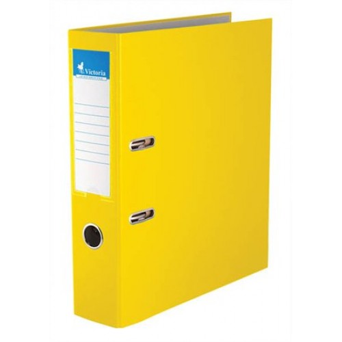 Žltý pákový zakladač Victoria 75 mm bez spodného kovania chráni nábytok a je vhodný na uchovávanie dokumentov formátu A4 a na každodenné použitie. Má chrbtový otvor a vymeniteľný chrbtový štítok. Zvonka PVC povrch, zvnútra kartón.